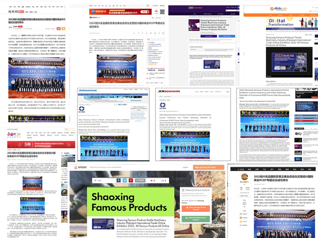 In order to ensure the exhibiting effect of enterprises and promote the brand culture of Shaoxing famous enterprises, the Pakistan station of Shaoxing famous textile machinery online exhibition adopts multi-channel domestic and international publicity and promotion. , ASIA ONE, ETnet, Gbnconnect, Tumblr, China.com, CDC, Sina.com, Phoenix.com, and more than 100 media from around the world, Pakistan and domestically, to create momentum for the exhibition and attract traffic to online platforms. Through the publicity reports from more than 20 overseas countries such as the United States, Japan, India, Thailand, Vietnam and other well-known domestic media, a total of millions of news page views have been gained, and the number of visits to the Shaoxing Cloud Exhibition platform has surged. The international influence will continue to expand, which will also guide more companies to take the initiative to go overseas, extend the chain, build brands, expand the market, and promote high-quality economic and social development through the transformation and upgrading of foreign trade.